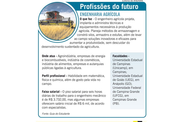 Com estigma de profissão do campo, a engenharia agrícola hoje não se resume ao projeto de maquinário para plantações. O profissional da área emprega tecnologia no gerenciamento de todo processo agropecuário — inclusive na transformação do produto dentro das indústrias. E a área cresce colada com o aumento da população mundial, uma vez que o Brasil é um dos maiores produtores de alimentos do mundo. Por isso, a atividade foi apontada pela Federação Nacional das Indústrias do Rio de Janeiro (Firjan) como uma das profissões do futuro. A engenharia agrícola tem diferenças fundamentais da agronomia, em que a fisiologia, biologia e qualidade da lavoura são o foco principal. Além de administrar equipamentos necessários à produção agrícola, o engenheiro planeja e se preocupa com os melhores métodos de transporte e armazenagem da colheita. E o entorno de Campinas é um dos principais polos empregadores do profissional no País. Empresas como a John Deere e dezenas de indústrias petroquímicas em Paulínia absorvem grande parte da mão de obra formada na região. Mas companhias que aparentemente não teriam nada a ver com a área, como a Natura e Procter & Gamble, também precisam de engenheiros agrícolas em sua grade de funcionários.