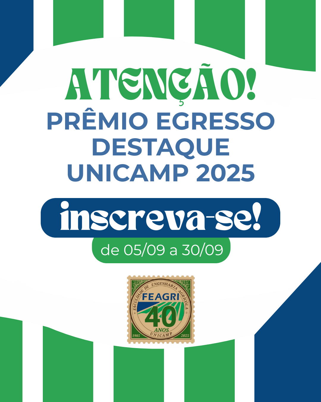 Estão abertas as inscrições para o Prêmio Egresso Destaque Unicamp 2025, uma iniciativa que reconhece e valoriza as trajetórias inspiradoras de nossos ex-alunos de Graduação e Pós-Graduação da FEAGRI.